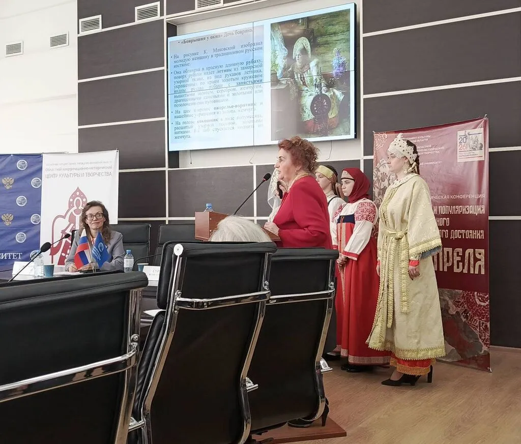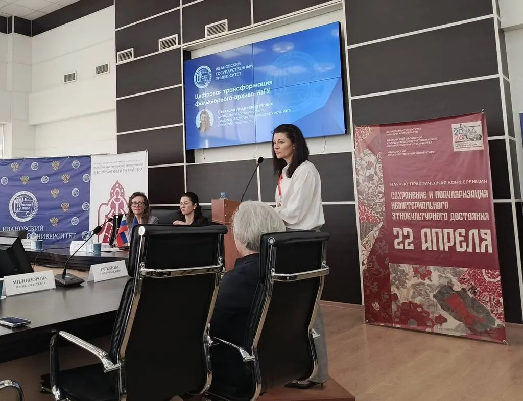 22 апреля в городе Иваново Центр русского народного творчества принял участие в научно-практической конференции «Сохранение и популяризация нематериального этнокультурного достояния», подготовленной Областным координационно-методическим центром культуры и творчества совместно с Ивановским государственным университетом. Среди спикеров конференции - Кувшинская Юлия Михайловна, доцент Школы лингвистики факультета гуманитарных наук Национального исследовательского университета Высшая школа экономики, руководитель студенческих фольклорных экспедиций, г. Москва; Маник Светлана Андреевна, директор Института гуманитарных наук, доктор филологических наук, доцент кафедры зарубежной филологии ИвГУ; Валькевич Светлана Ивановна, доктор культурологии, профессор кафедры культурологии и изобразительного искусства Шуйского филиала ФГБОУ ВО «Ивановский государственный университет»; Раскатова Елена Михайловна, доктор исторических наук, кафедры философии ИвГУ, руководитель научно-